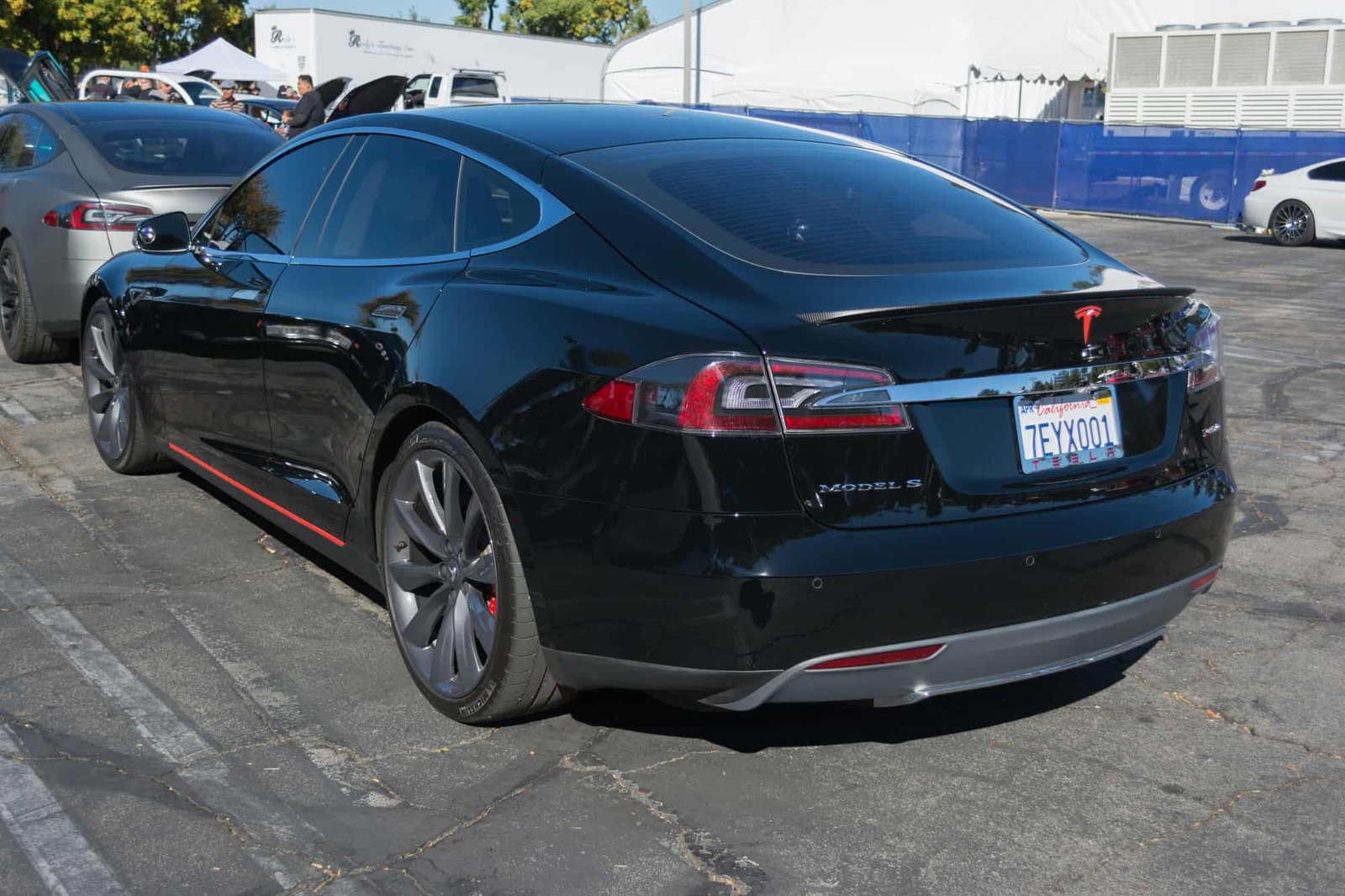 Tesla Model S on the side in a car park